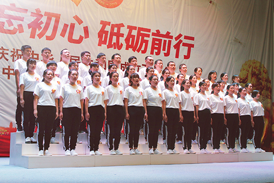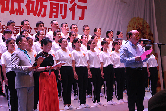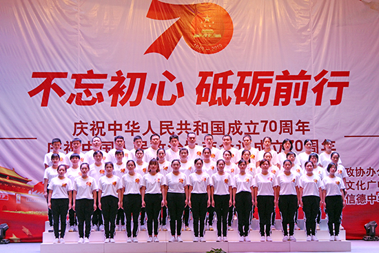 | 2019年9月20日,由辛集市政協(xié)辦公室、辛集市文化廣電體育和旅游局主辦,辛集市信德中學(xué)承辦的慶祝新中國成立70周年和中國人民政治協(xié)商會(huì)議成立70周年文藝演出在信德中學(xué)禮堂隆重舉行。 辛集市委副書記、政協(xié)主席姜?怠⒄䥇f(xié)副主席崔文英、政協(xié)副主席陳貴房,文化廣電體育和旅游局局長馬懷建、市委辦副主任范士杰、教育局副局長姜彥華,民盟、民建、民革、九三學(xué)社、僑聯(lián)等民主黨派代表出席本次慶祝活動(dòng)。河北國超信息科技有限公司(以下稱“我公司”)、河北申科電子股份有限公司、萬愛農(nóng)業(yè)科技有限公司、河北天意行榮威4S店、辛集一街荷塘月色舞蹈隊(duì)、辛集市實(shí)驗(yàn)學(xué)校、辛集市信德中學(xué)等單位的職工代表隊(duì)表演了精彩的節(jié)目。 我公司四十余名員工由總經(jīng)理曹艷爽親自帶隊(duì),組成合唱團(tuán)參加了本次演出。公司高層領(lǐng)導(dǎo)高度重視本次演出,為順利完成本次文藝演出,公司黨支部、工會(huì)與各部門負(fù)責(zé)人認(rèn)真組織部署,共先后組織員工精心排演20余次。文藝演出在我公司42名員工激昂、深情的《我和我的祖國》大合唱中拉開序幕,接著我們演唱了熱情、歡快的《洗衣歌》,用歌聲表達(dá)了對(duì)黨和祖國的熱愛,把對(duì)黨的追隨凝聚成力量,用出色的演出詮釋了不忘初心、牢記使命的錚錚誓言,獲得在場觀眾和領(lǐng)導(dǎo)的高度贊譽(yù)。