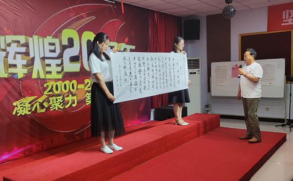 | 二十年崢嶸歲月,二十年風(fēng)雨兼程。二零零零六月間,萬物生長夏初天,河北國超剛起步,轉(zhuǎn)眼已經(jīng)二十年。風(fēng)風(fēng)雨雨匆匆過,兢兢業(yè)業(yè)苦鉆研,同舟共濟(jì)齊努力,勤勤懇懇譜新篇。二十年只是歷史長河中的一剎那,卻是那么的波瀾壯闊。二十年的風(fēng)雨坎坷,二十載辛勤耕耘,二十年見證了昨日的櫛風(fēng)沐雨,二十年守望著明天的燦爛輝煌。2020年6月5日,河北國超信息科技有限公司成立二十周年慶典在公司多媒體會議室隆重舉行。 參加此次盛會的有公司董事長劉占查、副董事長劉暢、總經(jīng)理曹艷爽、副總經(jīng)理尹長亮、副總經(jīng)理張軍帥,以及公司各部門管理人員和全體員工。慶典還特別邀請了合資公司北京分公司的喬航副總經(jīng)理、李華峰部長、張波室長、袁川室長、自動化工程專家楊廣鑫老師等。出席此次二十周年慶典活動的一百多名公司的同仁以及嘉賓,共同為公司二十周歲生日歡呼慶祝,共同分享這份喜悅和精彩。 本次周年慶典為期一天,上午9點(diǎn)半,周年慶典正式開始。公司董事長劉占查、總經(jīng)理曹艷爽、副總經(jīng)理尹長亮、副總經(jīng)理張軍帥分別為慶典發(fā)表了熱情洋溢的致辭,中層領(lǐng)導(dǎo)及部分員工代表也分別發(fā)言,闡述了在公司的奮斗歷程,表達(dá)了公司全體員工堅(jiān)定信念,不斷進(jìn)取,為實(shí)現(xiàn)百年國超的目標(biāo)而努力奮斗的信心和決心。期間播放了公司二十周年發(fā)展歷程宣傳片,參觀了公司文化墻,全體員工及與會嘉賓表演了詩歌朗誦、獨(dú)唱、大合唱、三句半、京劇等豐富多彩的文藝節(jié)目。慶典現(xiàn)場歡歌笑語,體現(xiàn)了“凝心聚力 筑夢未來”的主題,到處洋溢著喜慶氣氛。合資公司為公司二十周年贈送了精美的紀(jì)念品,與會嘉賓特地為這個特殊的日子編寫了詩詞并獻(xiàn)上了珍貴的書法墨寶,表達(dá)了對公司二十年奮斗歷程的贊譽(yù)和未來大展宏圖的祝福。 憶往昔歲月崢嶸艱,看今朝國超不畏難。董事長劉占查深情演唱了歌曲《敢問路在何方》,感謝十年來全體員工辛勤與陪伴,感謝各界朋友的大力支持,希望新的一年里,全體員工再接再厲,緊跟公司的前進(jìn)步伐,再創(chuàng)輝煌!
