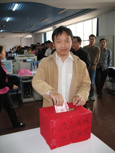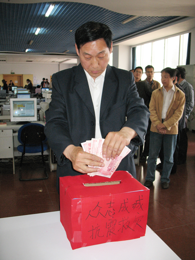 2008年5月12日14時28分,四川省汶川縣發(fā)生8.0級地震,給當?shù)鼐用裨斐删薮蟮纳拓敭a(chǎn)損失。為支援災(zāi)區(qū)人們抗震救災(zāi),重建家園,2008年5月15日上午,公司組織“心系災(zāi)區(qū),愛心捐獻”活動。